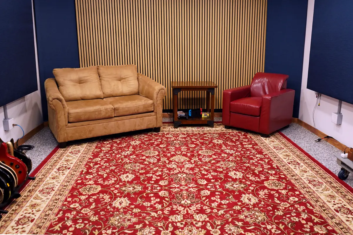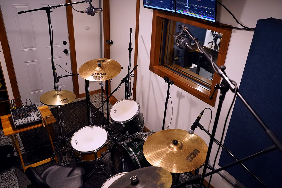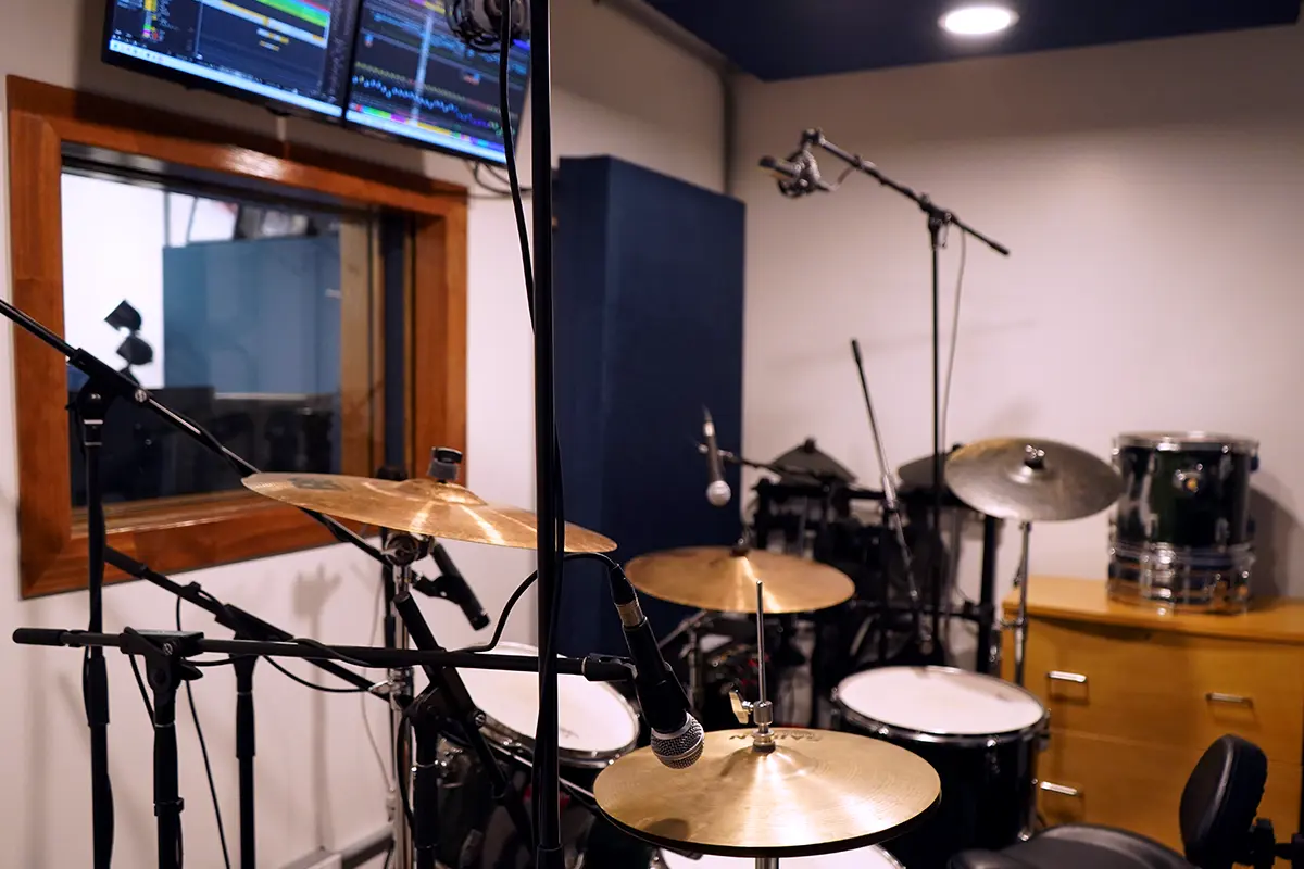 A dedicated isolation booth allows live tracking off the floor with isolation for drums, vocals, and more. The space also supports multi-camera live streaming for performances and sessions.